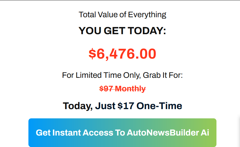 Awesome, I like your excitement, All you have to do is click any of the buy buttons on the page, and secure your copy of AutoNewsBuilder Ai at a one-time fee