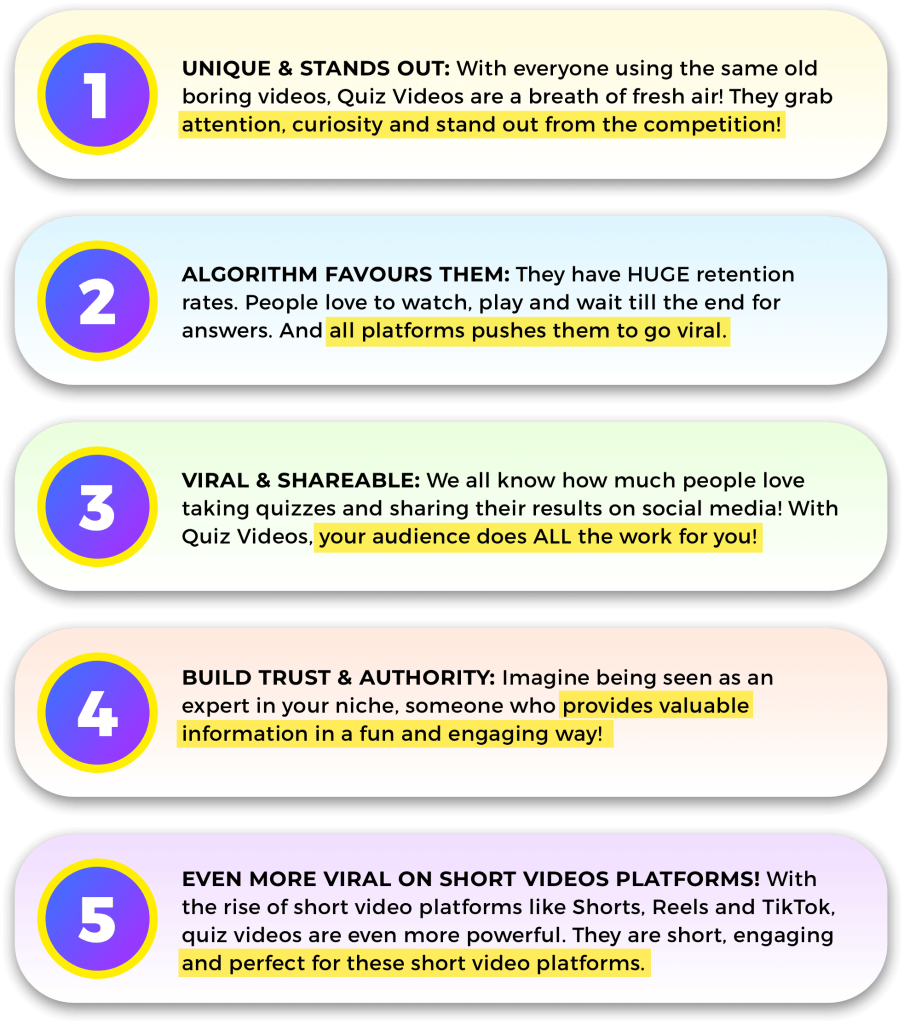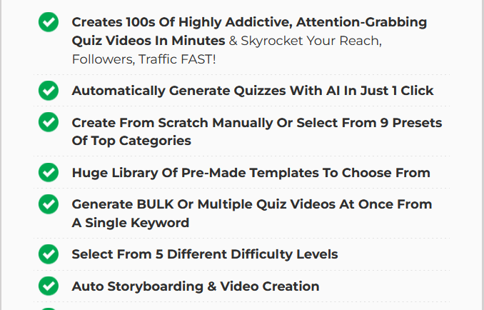 ✔️Save Time, Money, and Effort With Our “3E + Proprietary AI Tech: No more hiring expensive freelancers or spending hours brainstorming and designing quiz videos.